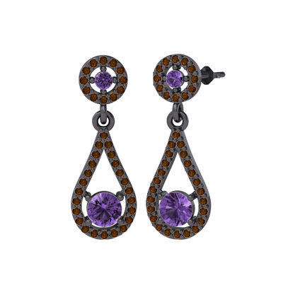 Ametist ve dumanlı kuvars 925 ayar siyah rodyum kaplama gümüş küpe