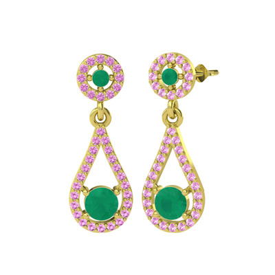Kök zümrüt ve pembe kuvars 18 ayar altın küpe