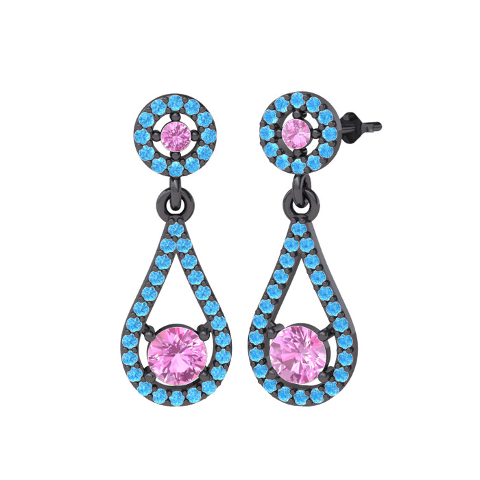 Pembe kuvars ve akuamarin 925 ayar siyah rodyum kaplama gümüş küpe