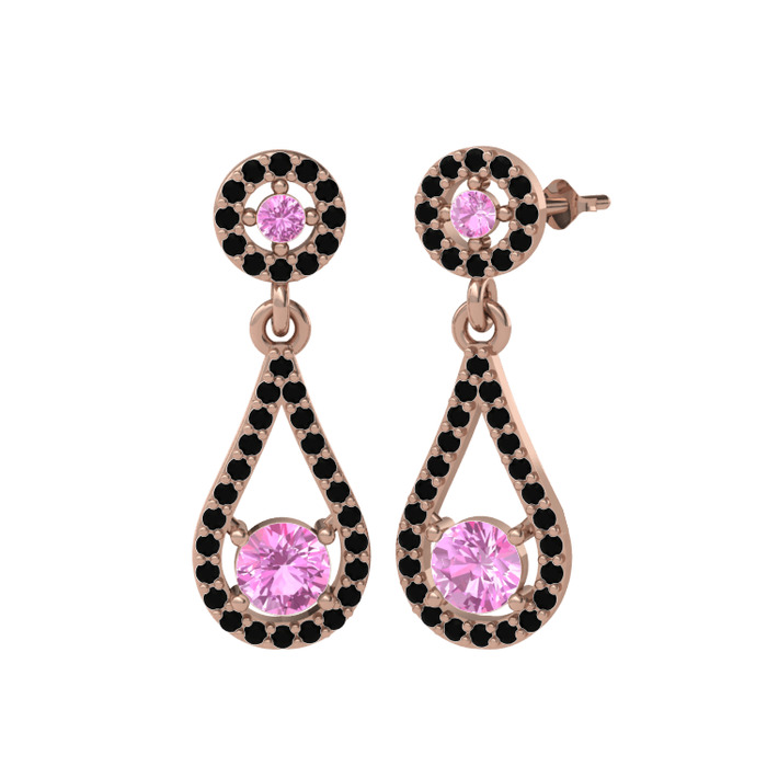 Pembe kuvars ve siyah zirkon 14 ayar rose altın küpe