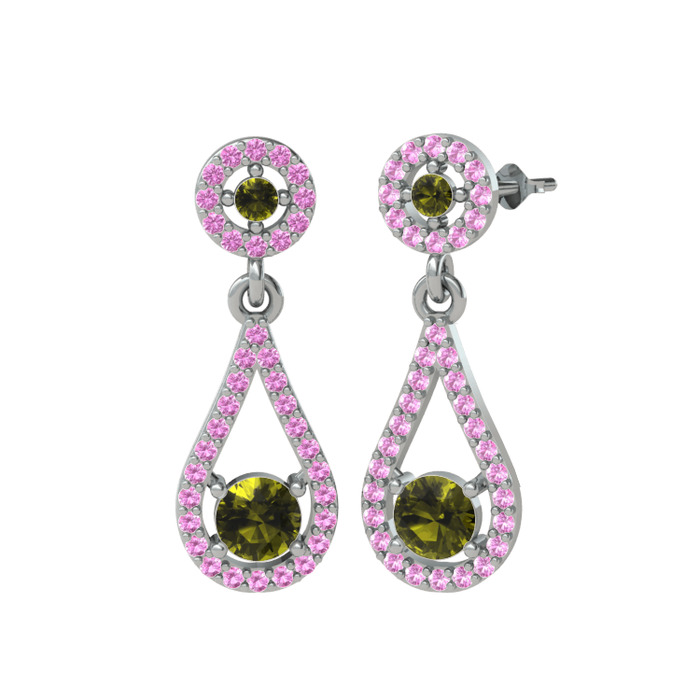 Peridot ve pembe kuvars 14 ayar beyaz altın küpe