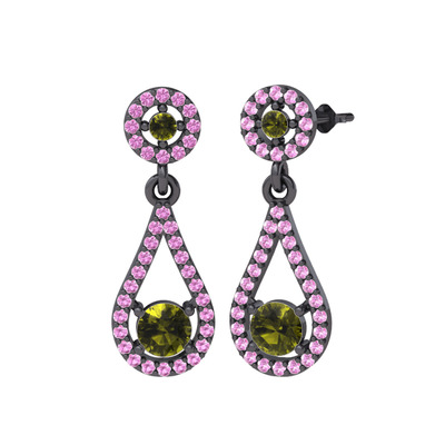 Peridot ve pembe kuvars 925 ayar siyah rodyum kaplama gümüş küpe