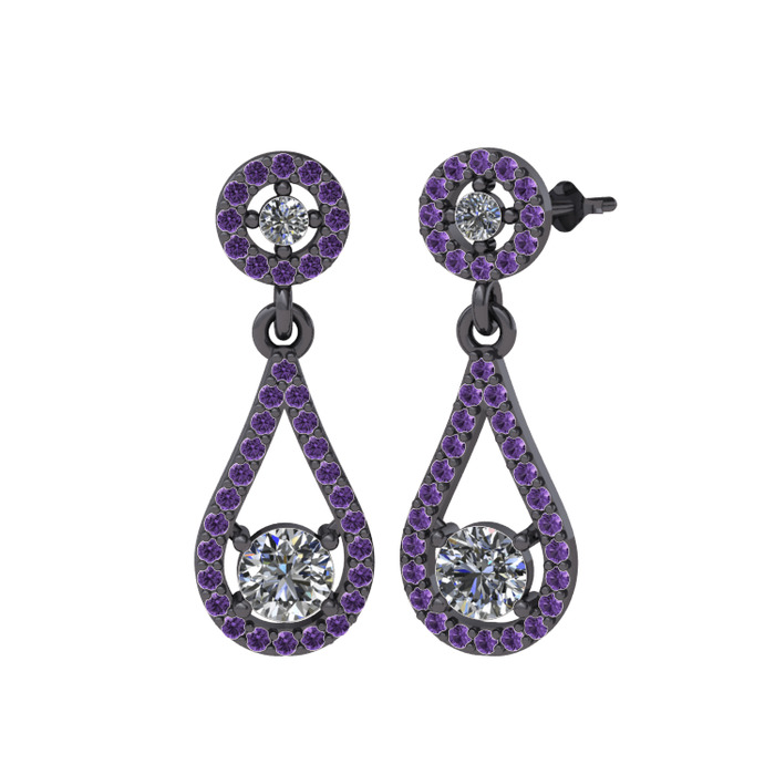 Pırlanta ve ametist 925 ayar siyah rodyum kaplama gümüş küpe (2 karat)