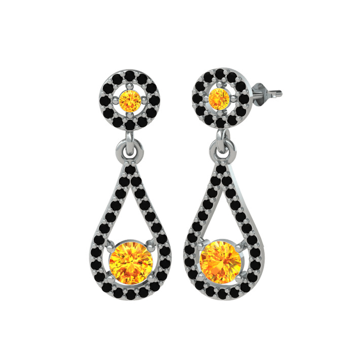 Sitrin ve siyah zirkon 14 ayar beyaz altın küpe