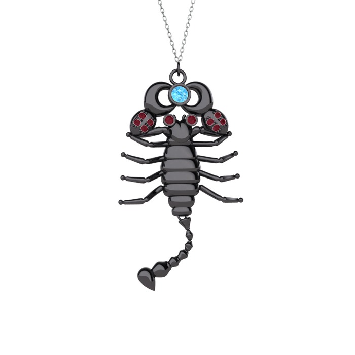 Akuamarin ve kök yakut 925 ayar siyah rodyum kaplama gümüş kolye (40 cm beyaz altın rolo zincir)