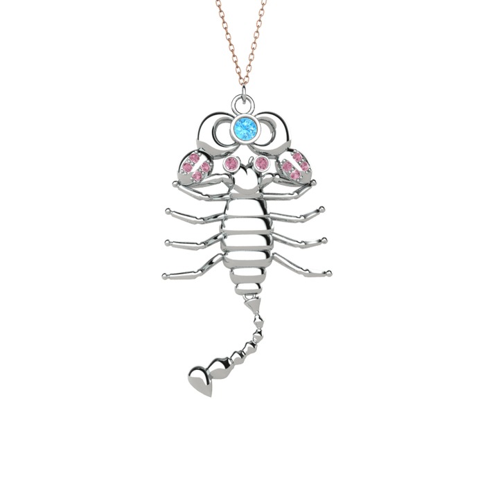 Akuamarin ve pembe kuvars 18 ayar beyaz altın kolye (40 cm rose altın rolo zincir)