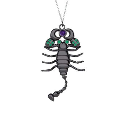Ametist ve kök zümrüt 925 ayar siyah rodyum kaplama gümüş kolye (40 cm beyaz altın rolo zincir)