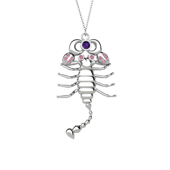 Ametist ve pembe kuvars 18 ayar beyaz altın kolye (40 cm gümüş rolo zincir)