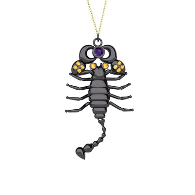 Ametist ve sitrin 925 ayar siyah rodyum kaplama gümüş kolye (40 cm altın rolo zincir)