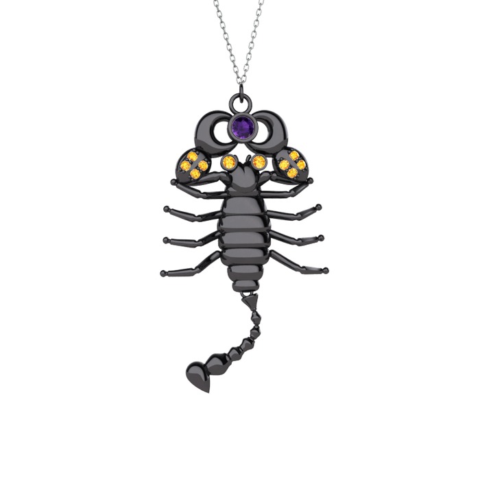 Ametist ve sitrin 925 ayar siyah rodyum kaplama gümüş kolye (40 cm gümüş rolo zincir)
