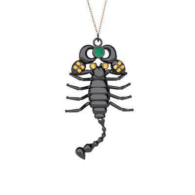 Kök zümrüt ve sitrin 925 ayar siyah rodyum kaplama gümüş kolye (40 cm rose altın rolo zincir)