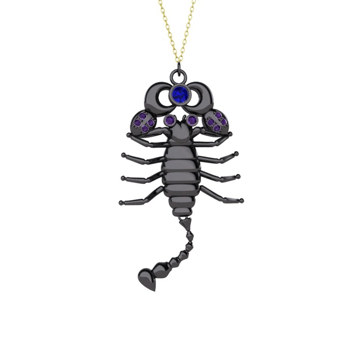 Lab safir ve ametist 925 ayar siyah rodyum kaplama gümüş kolye (40 cm altın rolo zincir)