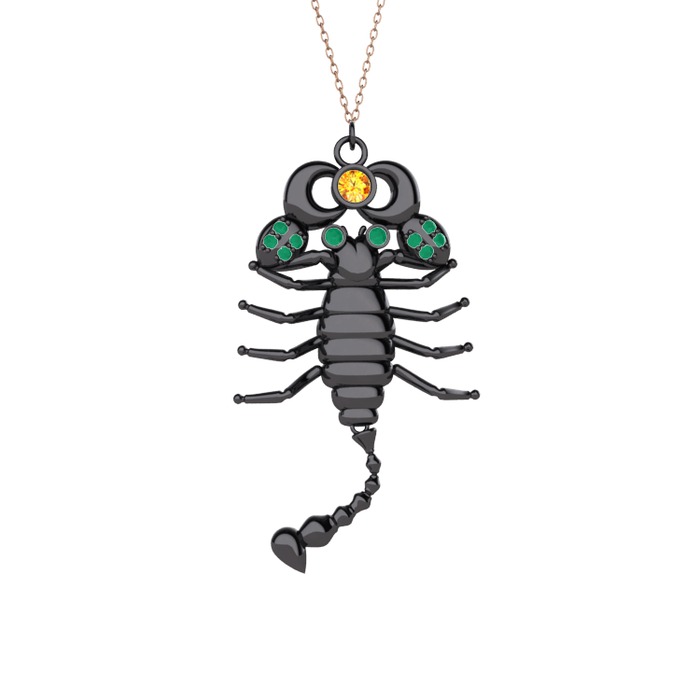 Sitrin ve kök zümrüt 925 ayar siyah rodyum kaplama gümüş kolye (40 cm rose altın rolo zincir)