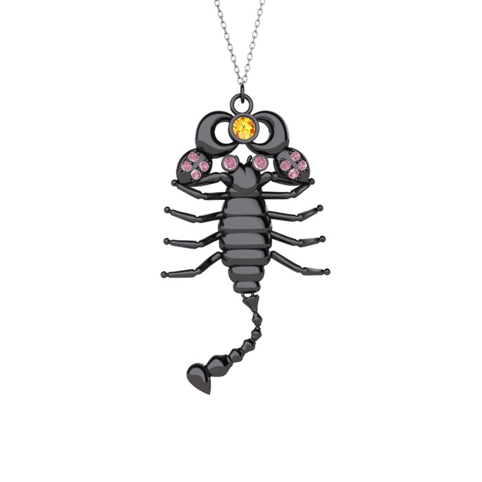 Sitrin ve pembe kuvars 925 ayar siyah rodyum kaplama gümüş kolye (40 cm beyaz altın rolo zincir)