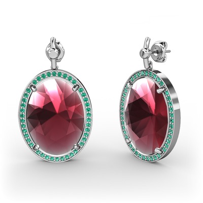 Kök yakut ve yeşil kuvars 14 ayar beyaz altın küpe