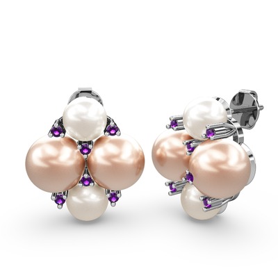 Inci, pembe inci ve ametist 14 ayar beyaz altın küpe
