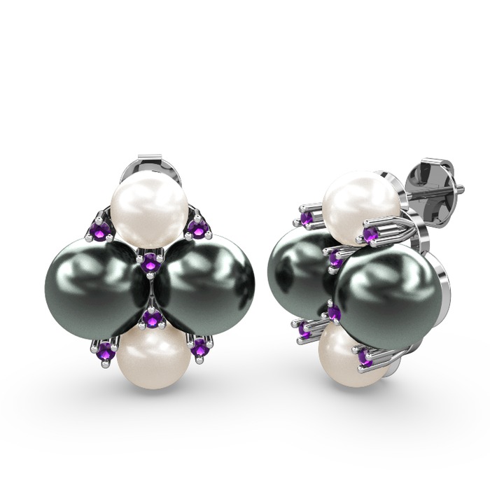 Inci, siyah inci ve ametist 14 ayar beyaz altın küpe