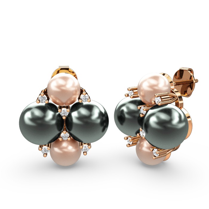 Pembe inci, siyah inci ve beyaz zirkon 18 ayar rose altın küpe