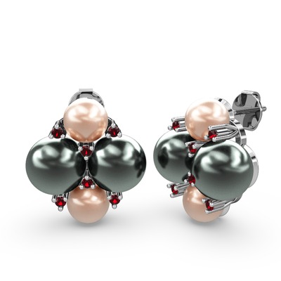 Pembe inci, siyah inci ve garnet 8 ayar beyaz altın küpe