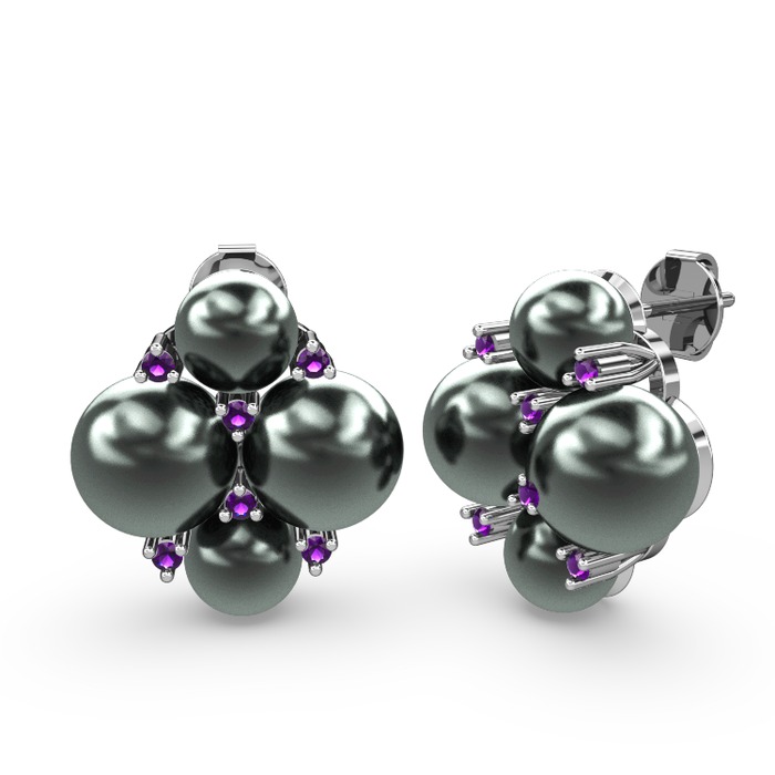 Siyah inci ve ametist 8 ayar beyaz altın küpe