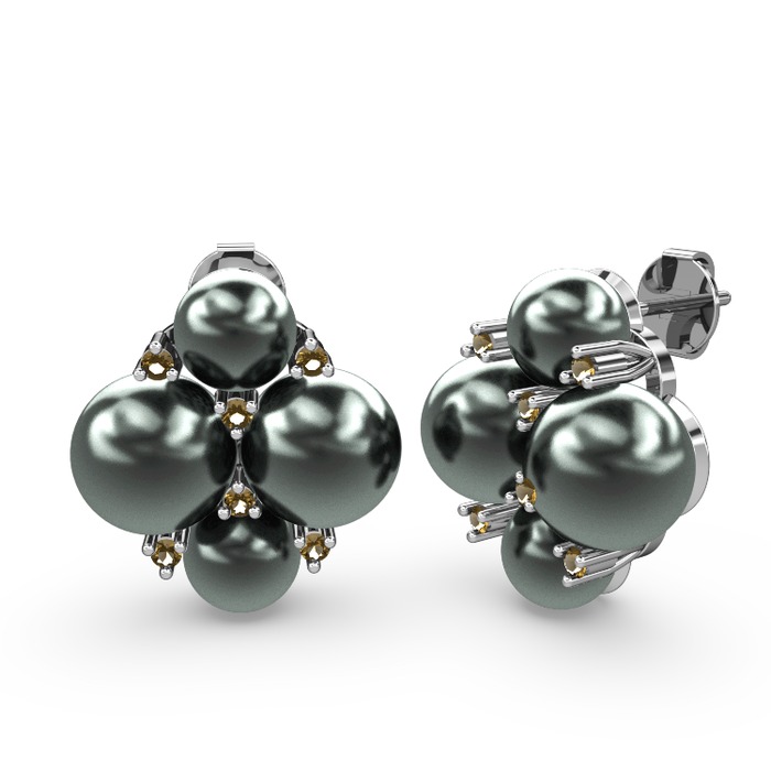 Siyah inci ve dumanlı kuvars 18 ayar beyaz altın küpe