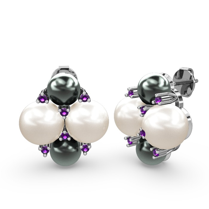 Siyah inci, inci ve ametist 18 ayar beyaz altın küpe
