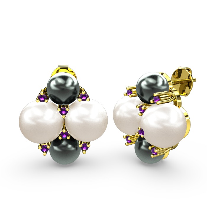 Siyah inci, inci ve ametist 8 ayar altın küpe