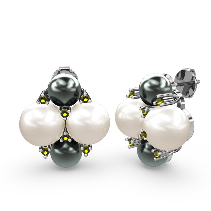 Siyah inci, inci ve peridot 18 ayar beyaz altın küpe