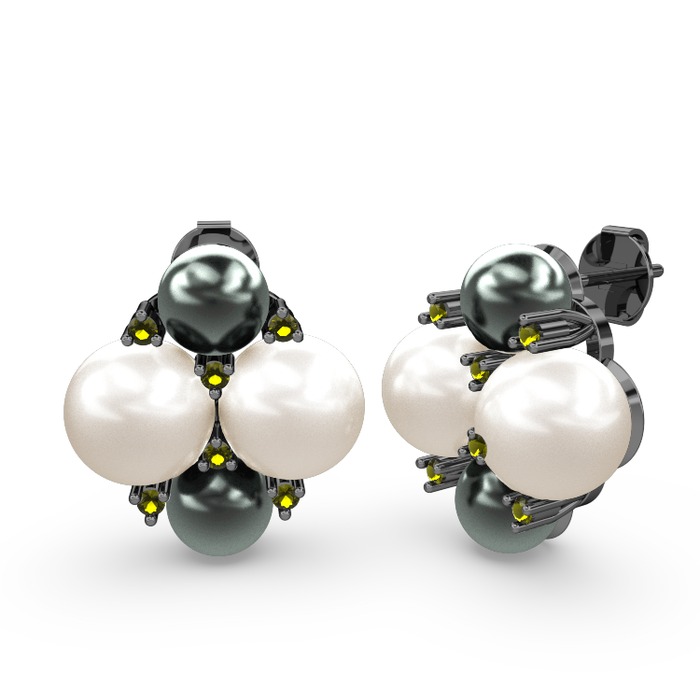 Siyah inci, inci ve peridot 925 ayar siyah rodyum kaplama gümüş küpe