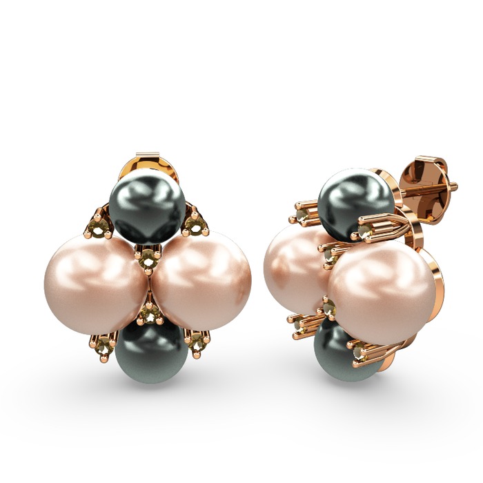 Siyah inci, pembe inci ve dumanlı kuvars 925 ayar rose altın kaplama gümüş küpe