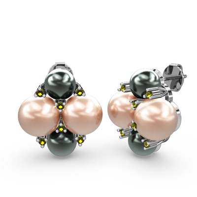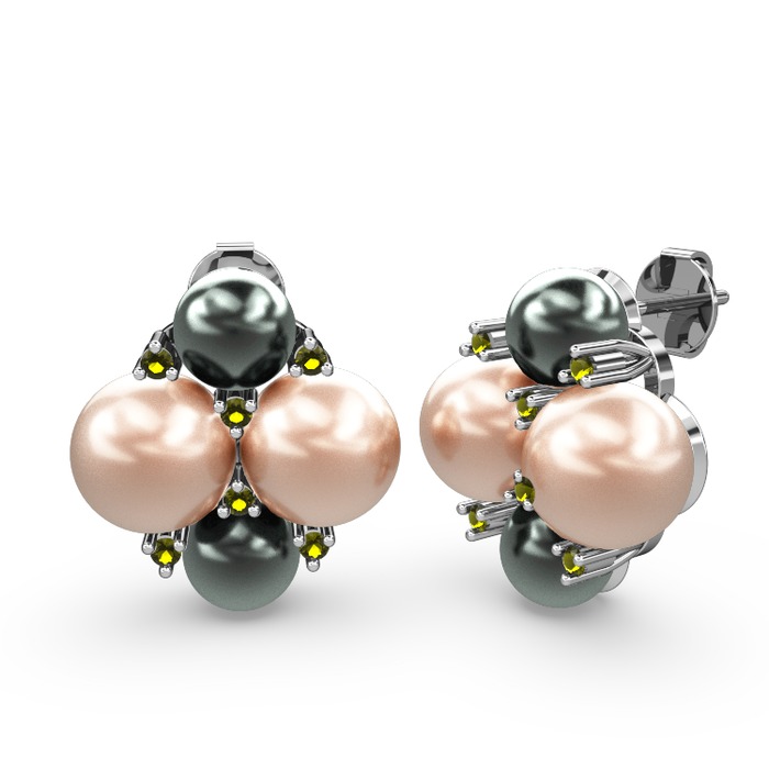 Siyah inci, pembe inci ve peridot 8 ayar beyaz altın küpe