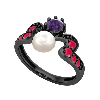 Inci, ametist ve kök yakut 925 ayar siyah rodyum kaplama gümüş yüzük