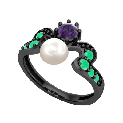 Inci, ametist ve kök zümrüt 925 ayar siyah rodyum kaplama gümüş yüzük
