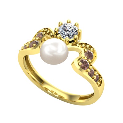 Inci, beyaz zirkon ve dumanlı kuvars 8 ayar altın yüzük