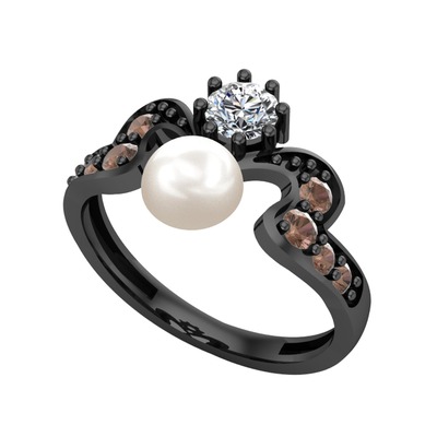 Inci, beyaz zirkon ve dumanlı kuvars 925 ayar siyah rodyum kaplama gümüş yüzük