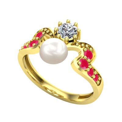 Inci, beyaz zirkon ve kök yakut 14 ayar altın yüzük