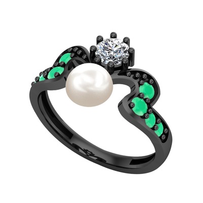 Inci, beyaz zirkon ve kök zümrüt 925 ayar siyah rodyum kaplama gümüş yüzük