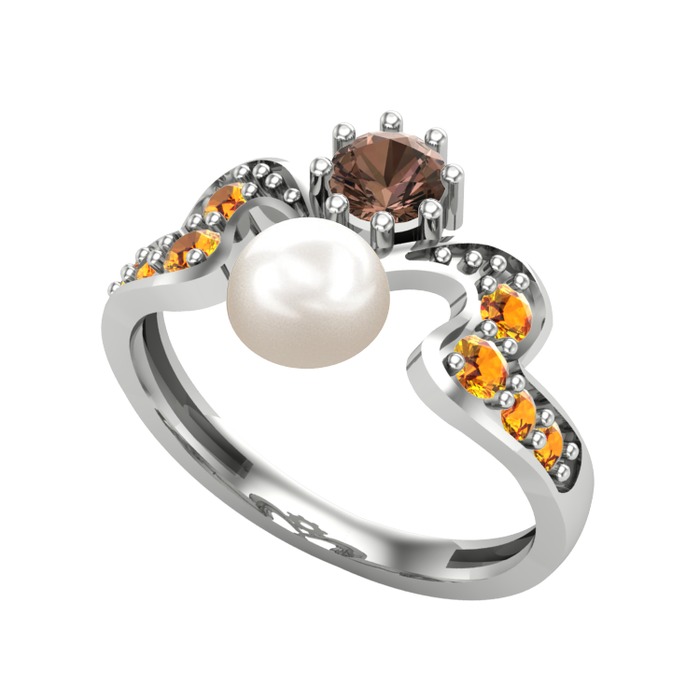 Inci, dumanlı kuvars ve sitrin 8 ayar beyaz altın yüzük