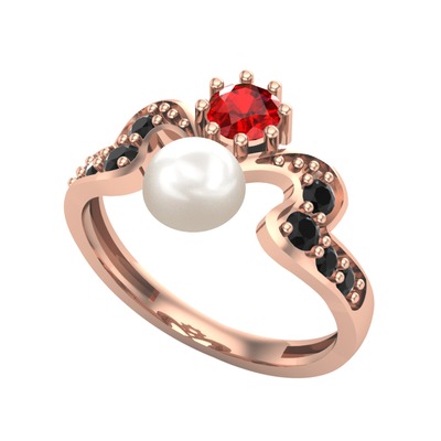 Inci, garnet ve siyah zirkon 14 ayar rose altın yüzük