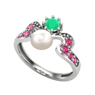Inci, kök zümrüt ve rodolit garnet 14 ayar beyaz altın yüzük