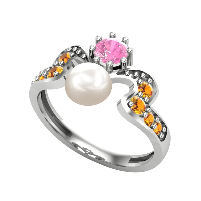 Inci, pembe kuvars ve sitrin 14 ayar beyaz altın yüzük