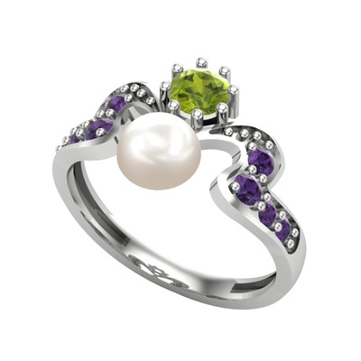 Inci, peridot ve ametist 8 ayar beyaz altın yüzük