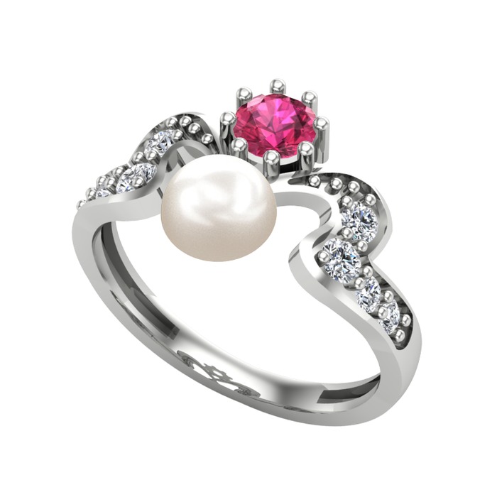 Inci, rodolit garnet ve beyaz zirkon 14 ayar beyaz altın yüzük