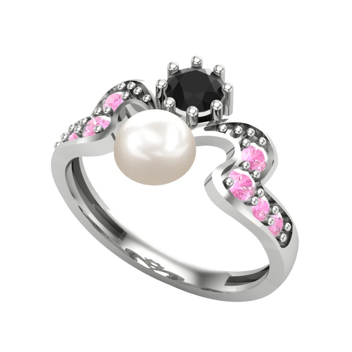 Inci, siyah zirkon ve pembe kuvars 18 ayar beyaz altın yüzük