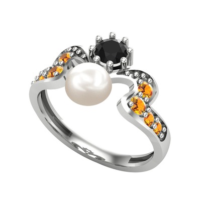 Inci, siyah zirkon ve sitrin 18 ayar beyaz altın yüzük