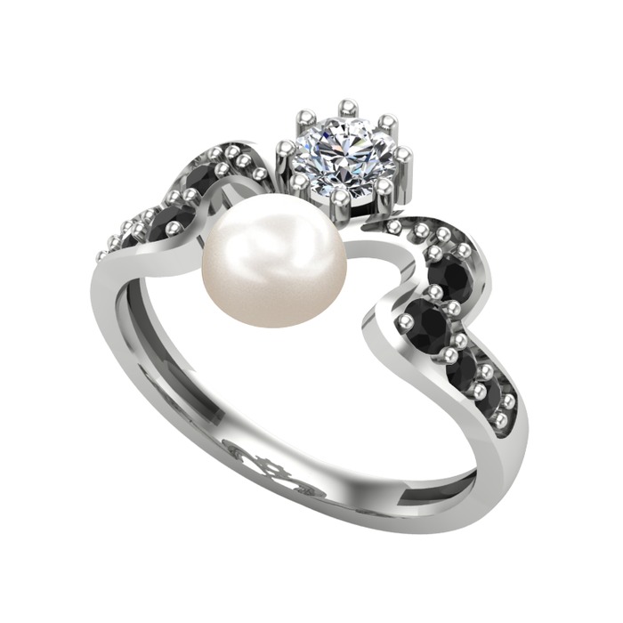 Inci, swarovski ve siyah zirkon 14 ayar beyaz altın yüzük