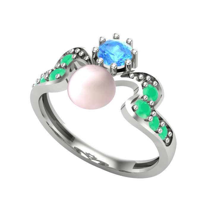 Pembe inci, akuamarin ve kök zümrüt 18 ayar beyaz altın yüzük