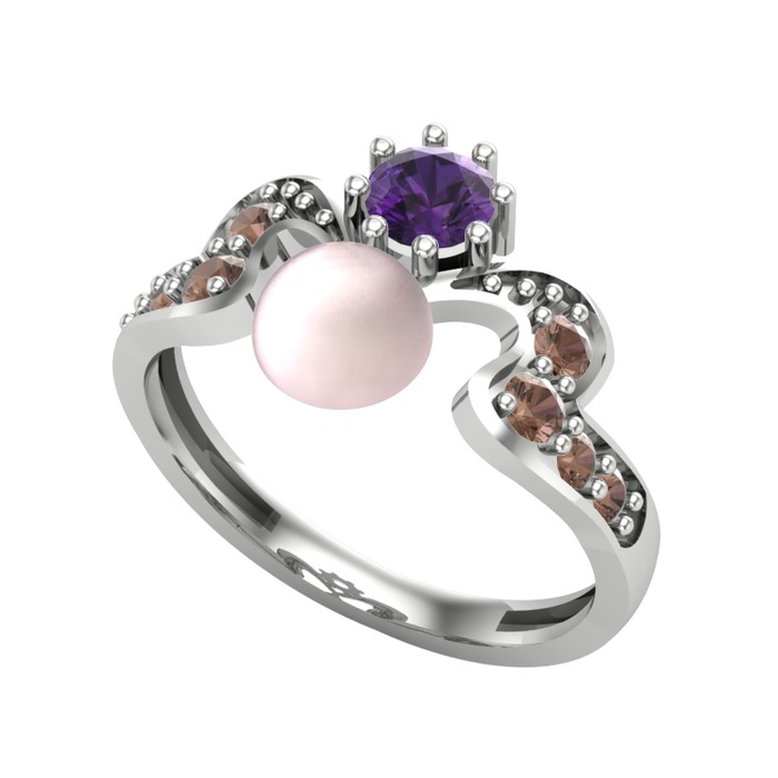 Pembe inci, ametist ve dumanlı kuvars 14 ayar beyaz altın yüzük