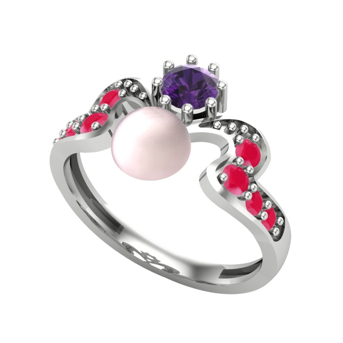 Pembe inci, ametist ve kök yakut 8 ayar beyaz altın yüzük