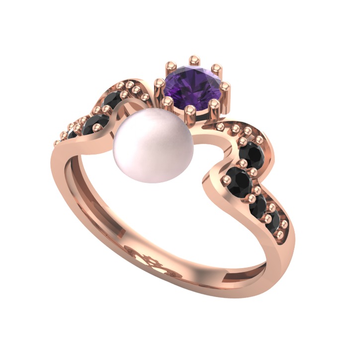 Pembe inci, ametist ve siyah zirkon 925 ayar rose altın kaplama gümüş yüzük